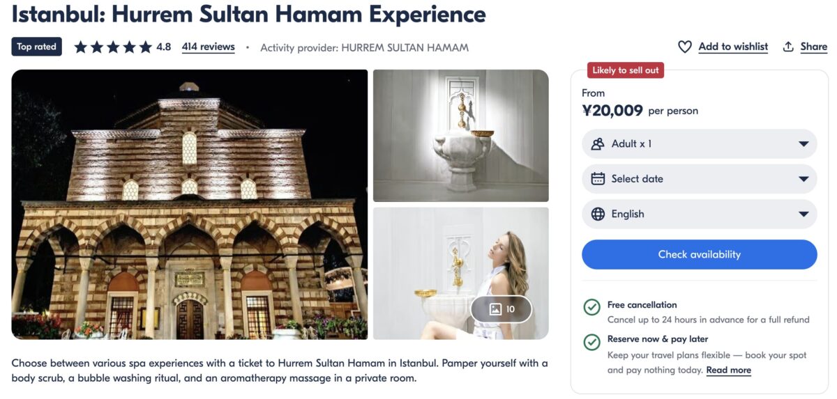 | ハセキ・ヒュッレム・スルタン・ハンマーム | 約50ユーロ〜185ユーロ | 基本的な入浴、マッサージ、スクラブ、バブルバス、ドリンク。オールインクルーシブのパッケージには食事も含まれます |